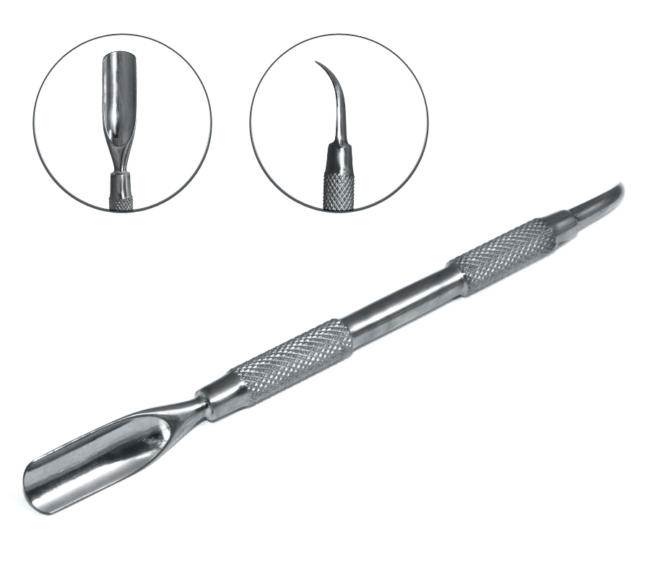 Пушер — это металлическая лопаточка для отодвигания кутикулы и птеригия (прозрачной пленочки между ногтевой пластиной и кутикулой). На противоположной стороне рукоятки пушера находится топорик. Это лопатка меньшего размера и другой формы. Ее можно использовать, чтобы счистить приросший к ногтю птеригий. Пушер должен иметь анатомическую форму и легко заходить под кутикулу на любом участке ногтевой пластины.