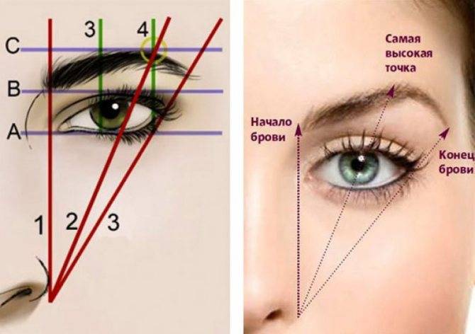 - Отметить высшую точку дуги: провести параллель через центр зрачка и крыла носа.