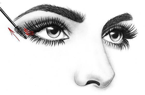 Тушь наносят снизу вверх, держа кисточку горизонтально и постепенно передвигаясь от середины века сначала к внешнему, а затем к внутреннему уголку. Этот способ позволяет быстро удлинить ресницы и не допустить их склеивания.