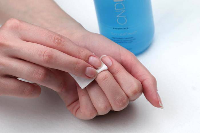 Обезжиривание. Ногтевую пластину нужно обезжирить при помощи специального средства – дегидратора, а при его отсутствии – дезинфектора, спирта или жидкости для снятия маникюра.