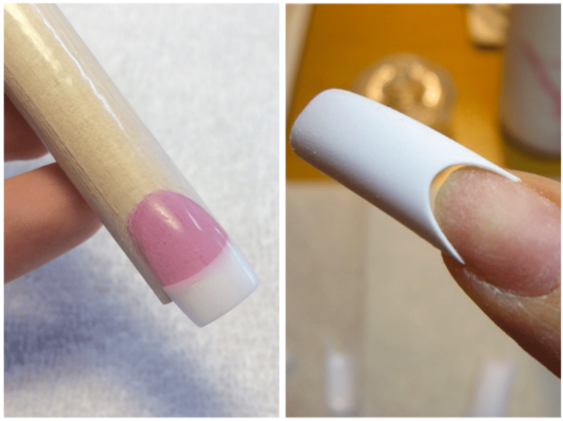 Также недостаточное количество клея, приводит к отклеиванию типса в боковых зонах. Между типсом и ногтем не должно образовываться воздушных пузырьков (белые пятнышки), иначе ноготь долго не продержится.