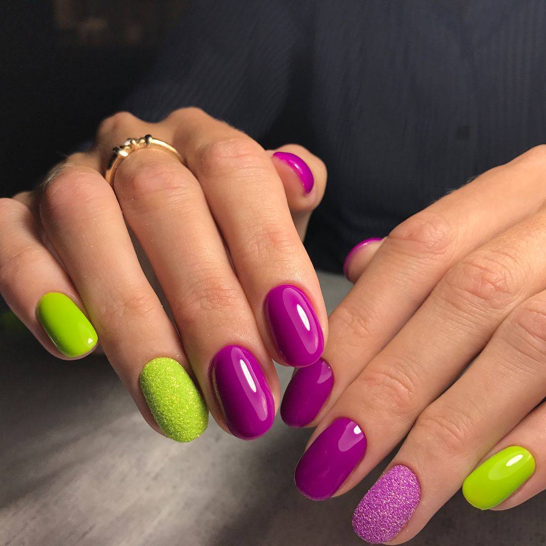 Яркость и совершенство фиолетового отлично подчёркивается жёлтым. Красный или коралловый чудесно сочетается с бирюзовым или зелёным. К этому определению также можно уверенно отнести сочетание в одном маникюре различных структур, где матовые, лаковые и перламутровые покрытия прекрасно гармонируют между собой в одном дизайне.