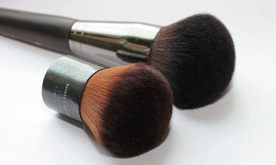 Кисть. При выборе стоит отдавать предпочтение изделиям из натурального ворса. Чтобы распределить косметику равномерно и придать коже естественный вид, нужно взять немного пудры на инструмент и растушевать по направлению от центра к вискам, мочкам ушей. С помощью кисти наносятся сухие типы пудры, особенно хорошо использовать её при растушёвке рассыпчатого вида. Так удаётся покрыть лицо максимально тонким слоем косметики.
