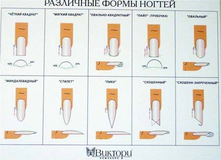 Каждому начинающему мастеру необходимо иметь представление о самых практичных и распространённых формах ногтевого края. Чаще всего это овал, квадрат, пайп, миндаль или стилет. Каждая форма по-своему особенна, удобна и красива. Разумеется, форму мастер может только предложить своей клиентке, а выбирать придётся ей самой, исходя из практических и эстетических соображений.