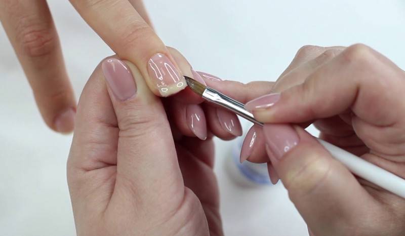 Небольшое количество полигеля кладем на нижнюю часть ногтя, приглаживая кистью, смоченной в жидкости.