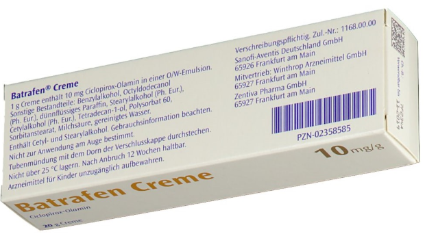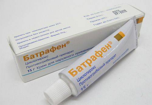Для лечения микозов ногтей, кожи и слизистых оболочек можно приобрести Батрафен крем, который многие ошибочно называют мазью. активного вещества циклопирокса в составе крема составляет 1%, что соответствует 10 мг на 1 г медикамента. Вспомогательные компоненты :