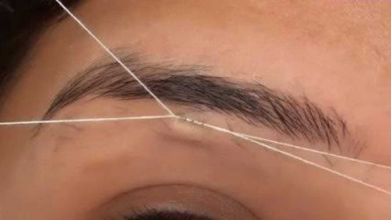- Держите строку до брови, так как вы делаете один круг больше, а другой меньше, эта средняя часть, которая намотана, захватит волосы, которые проходят, и удалит их. Будьте очень осторожны и практикуйте это медленно.