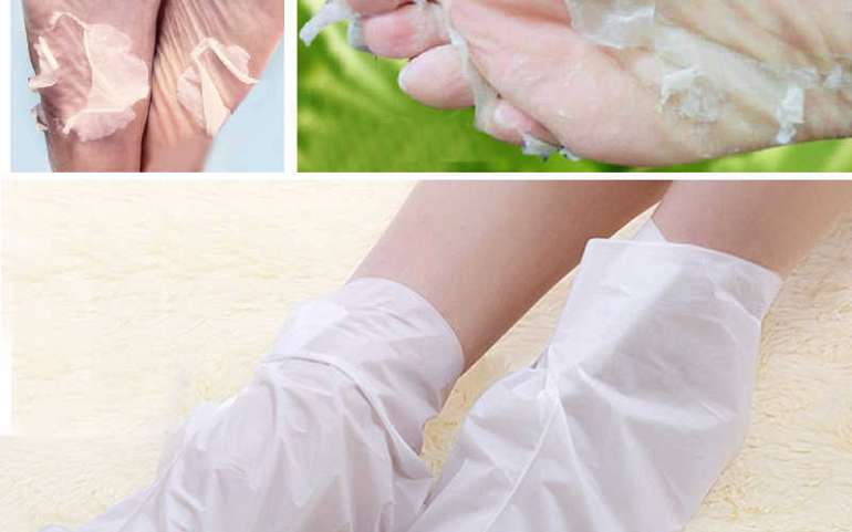 - Наносим кератолитик на ноги, надеваем бахилы или полиэтиленовые носочки, оставляем на 7-10 минут.