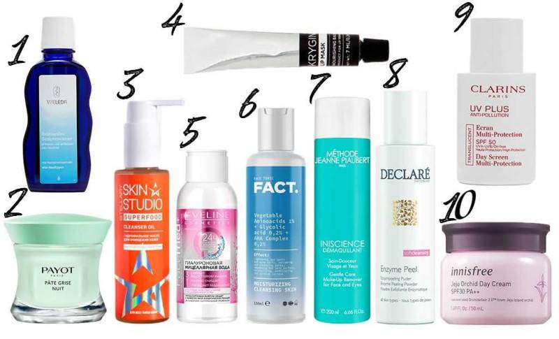 1 — оживляющий тоник для всех типов кожи Weleda, 2 — ночной крем против несовершентств кожи лица Payot, 3 — гидрофильное масло для очищения кожи Stellary Skin Studio, 4 — мультифункциональный бальзам-маска для губ Krygina Cosmetics, 5 — гиалуроновая мицеллярная вода Evelline Cosmetics, 6 — увлажняющий очищающий тоник для лица с аминокислотами, гликолевой кислотой и комплексом AHA-кислот Fact, 7 — очищающее молочко для лица и глаз Méthode Jeanne Piaubert, 8 — мягкий энзимный пилинг для лица Declare, 9 — защитный флюид-экран для лица с SPF 50, Clarins, 10 — Омолаживающий дневной крем с экстрактом орхидеи Innisfree