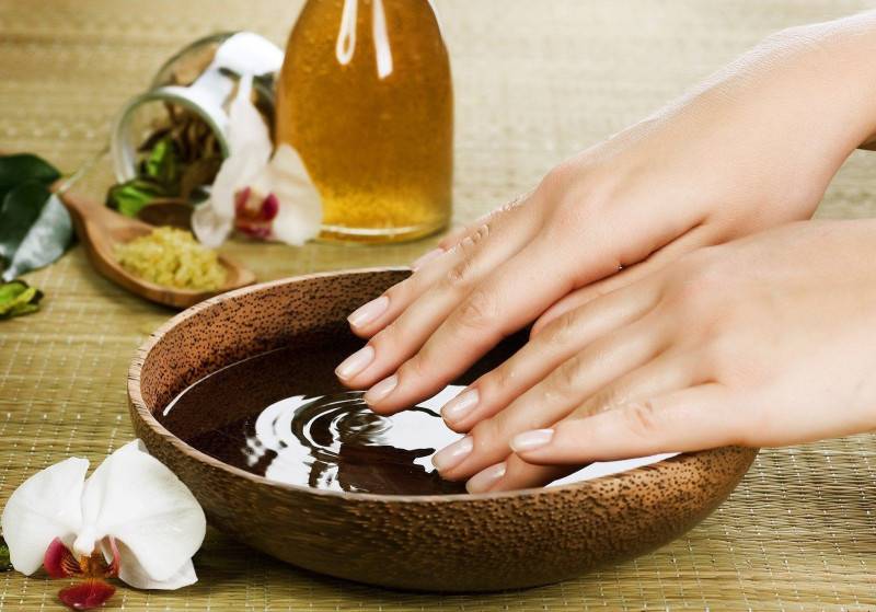 Самая эффективная ванночка – из морской соли, она аккуратно ухаживает за ноготками, снимая сухой слой кожи. Для нее на 100 мл горячей воды берется одна столовая ложка соли, которая в ней растворяется – количество раствора можно пропорциональна увеличивать. В массу нужно погрузить руки 15 минут, а затем промокнуть одноразовым полотенцем и нанести питательный крем или масло.