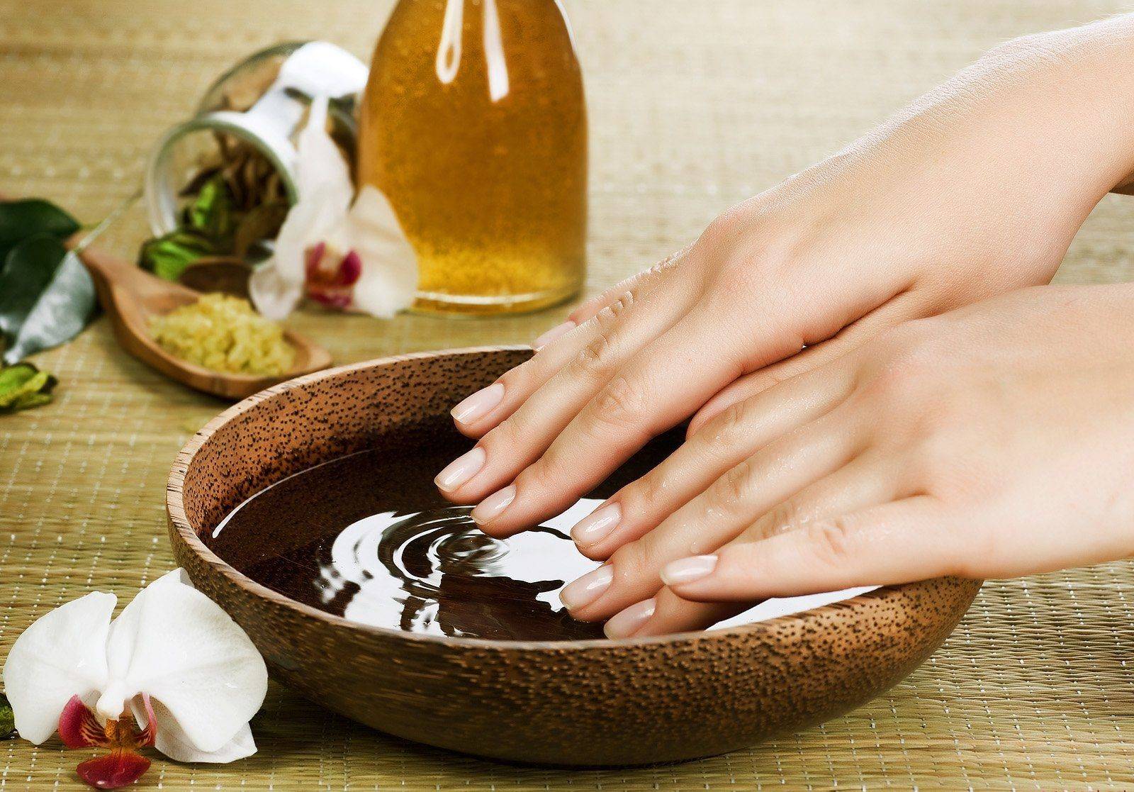 Самая эффективная ванночка – из морской соли, она аккуратно ухаживает за ноготками, снимая сухой слой кожи. Для нее на 100 мл горячей воды берется одна столовая ложка соли, которая в ней растворяется – количество раствора можно пропорциональна увеличивать. В массу нужно погрузить руки 15 минут, а затем промокнуть одноразовым полотенцем и нанести питательный крем или масло.