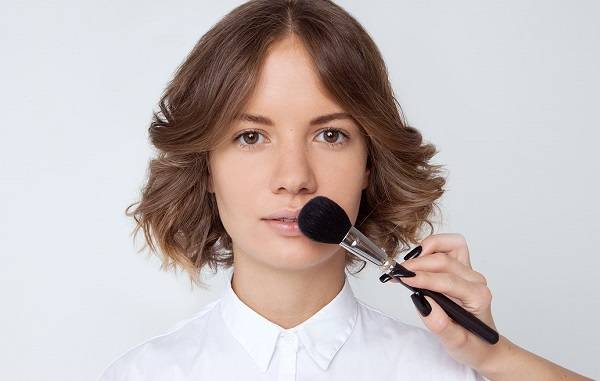 - Вторым этапом необходимо нанести незначительное количество пудры. Она помогает на дольше сохранить помаду на лице.