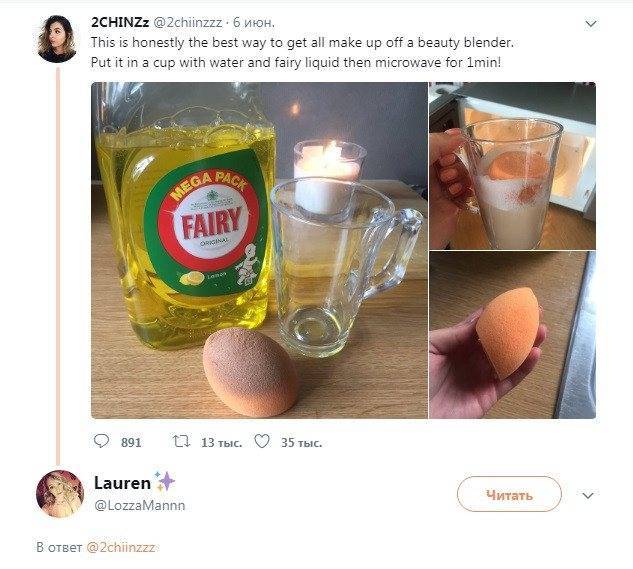 Этим способом как мыть спонж для макияжа в домашних условиях запостила блогер Laureen в своем Twitter. Постом поделились более 2,900 раз и насобирал он почти 10 тысяч лайков! Так что способ точно работает. Чтобы за 1 минуту очистить бьютиблендер девушка положила его в горячую воду, в которую до этого добавила средство для мытья посуды. Затем эту миску она поставила на 1 минуту в микроволновку. Когда она достала свой спонж: он был полностью очищен от тонального средства и другой косметики, жирных пятен и бактерий. У тебя на руках – новенький бьютиблендер!
