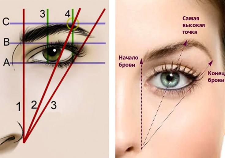 Теперь посмотрите прямо перед собой, и та линия, которая будет проходить от крыла носа через радужку вашего глаза и окажется 2-ей линией. Эта линия укажет вам на точку максимального изгиба и точку самого высокого места в вашей брови.