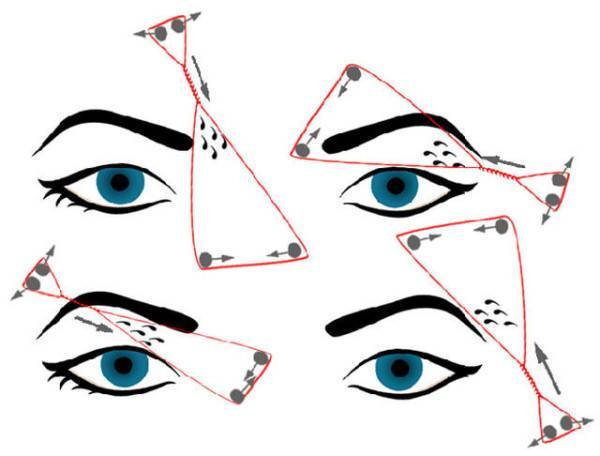 - Глаза. Для небольших глаз подходят среднего размера формы, для крупных — широкие. При близко посаженных глазах рекомендуется искусственно расширять расстояние между бровями, посредством удаления лишних волосков в области переносицы. Для широко посаженных — наоборот, не следует сильно разреживать область возле внутренних уголков глаз.