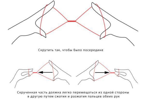 - Подготовить нить для выщипывания с помощью техники, приведенной выше. Она должна свободно и синхронно двигаться по пальцам.