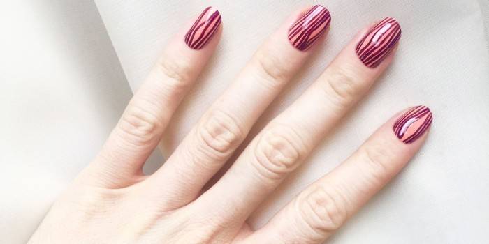 Линии наносятся по диагонали ногтя. Первую линию рисуют простую. Вторую, параллельно ей, с утолщением, идущем с середины линии. Похоже на очень узкий треугольник. Третью линию рисуют простую вдоль предыдущей. Четвертую рисуют с утолщением уже с другой стороны. Пятую – простую.