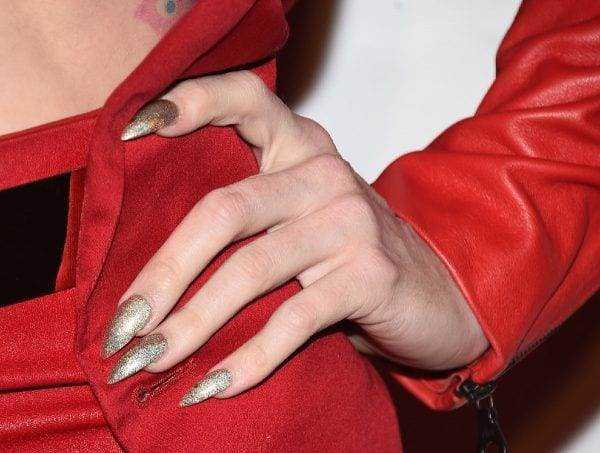 Данный дизайн ноготков отображен на фото и предназначен для женщин, которые не боятся показать окружающим свою дерзость. Длинные ноготки с треугольным срезом свободного края предпочитают молодые, уверенные в себе леди. Острая форма подчеркивает изящные кисти, длину и тонкость пальцев. К недостаткам относят процесс создания: для заостренности нужна крепкая ногтевая пластина, что бывает редко, поэтому применяется наращивание.
