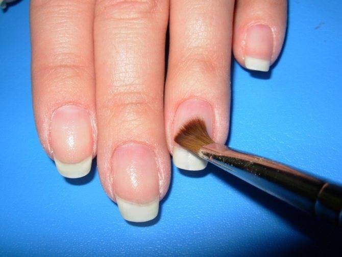 также нужно обработать торец свободного края, если ногти длинные (выступают за подушечки пальцев), то аккуратно нанести на отросшую внутреннюю часть;
