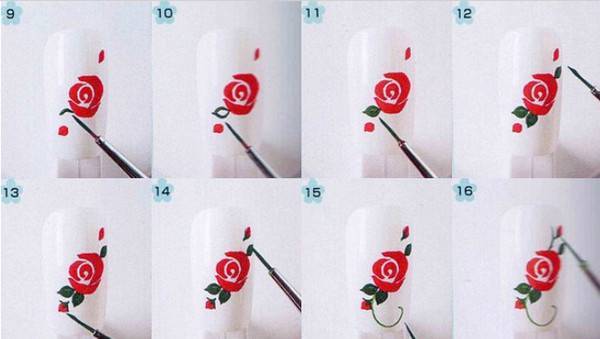 После того, как наращивание ногтей завершено, можно выполнить рисунки на ногтях пошагово, что весьма просто.