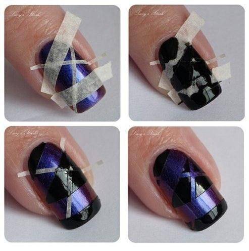 Лоскутки. Еще одна вариация со скотчем, помогающим создать множество разноцветных лоскутков на ногте.
