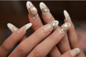 Простым маникюром сейчас уже никого не удивишь, поэтому модницы к каждому наряду стараются подбирать всевозможные украшения, в числе которых себя давно зарекомендовали стразы. Блестящие камушки, бульонки и жемчужины клеятся при помощи жидкого клея. Капните состав на ноготь, окрашенный в цветной или прозрачный лак, аккуратно приклейте украшение