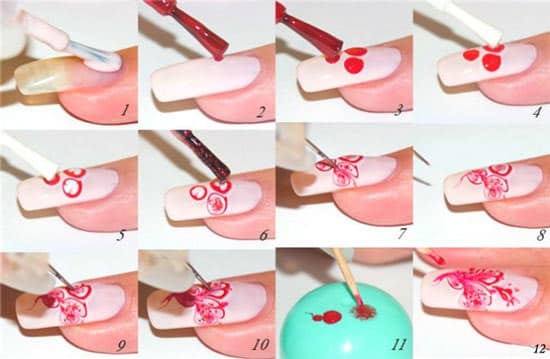 Что мы будем делать? Двумя сочетающимися цветами мы будем наносить основную часть ногтя и изюминку, а третьим — рисунок. Чтобы получился более удачный маникюр, не следует сразу же ставить перед собой сложную задачу. Для первого раза пусть это будут обычные изображения в виде (не)аккуратных клякс. В этом случае применим белый цвет как основной, розовый — изображая большую кляксу, а черный — несколько точек на розовом пятне. Есть также и другие варианты, в которых можно использовать несколько цветов. Например, маникюр в полоску, в котором необходимо будет добавить к списку инструментов скотч. Отделяя скотчем полосы, вы сможете достичь ровного, аккуратного и главное, красивого результата.