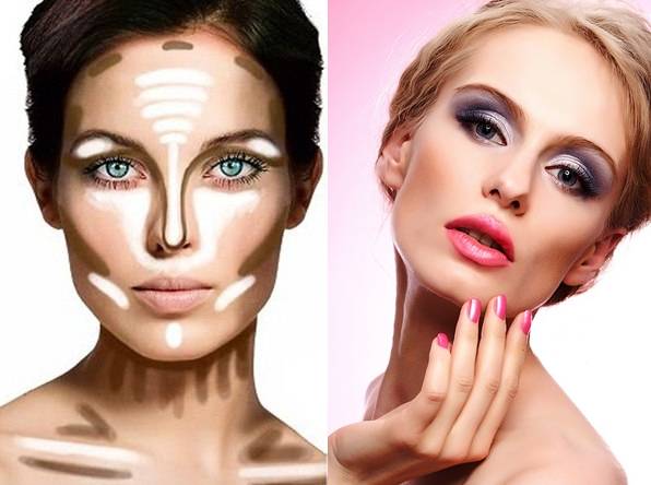 Контуринг же напротив, помогает создать эффект скульптурирования лица. С помощью темных оттенков контуринга можно создать иллюзию сужения и удлинения лица, скрыть двойной подбородок и делать несколько определенных факту в одну. Темные оттенки наносятся в углубления и придают объем на лице, визуально сужая его. С помощью контуринга можно скорректировать форму носа, визуально сделать подбородок более остроконечным или поднять опущенные скулы.