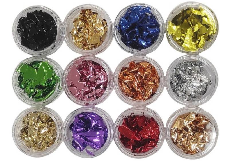 Продаётся жатая фольга в небольших пластиковых баночках в сжатом виде, внешне похожа на сусальное золото. Лучше всего она смотрится в сочетании с аквариумным дизайном.