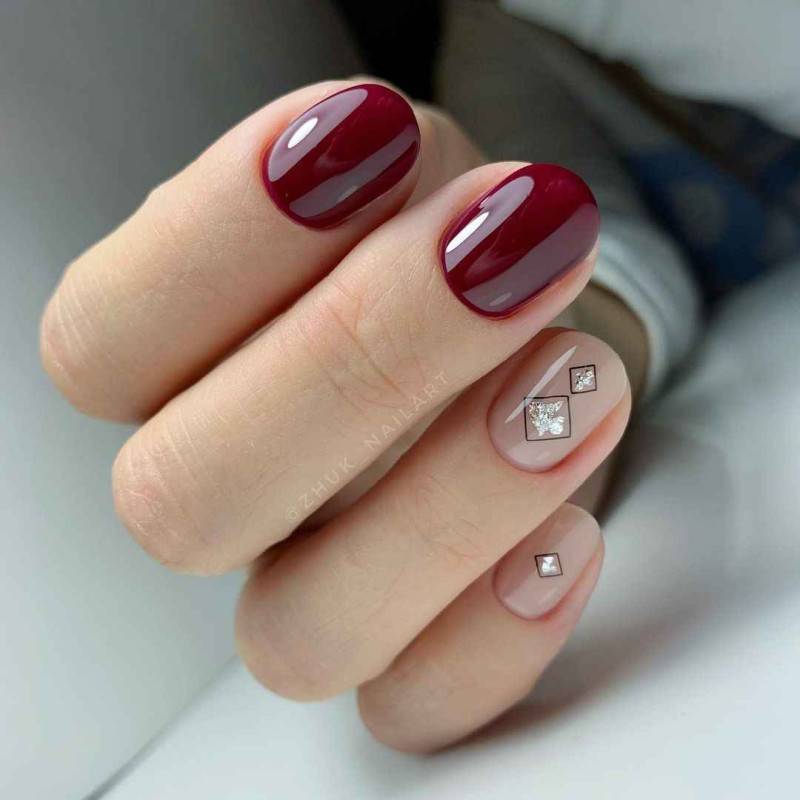Подчеркни несколько ноготков без цвета, лишь с помощью контрастных текстур. Матовые и порошковые поверхности, а также глиттер и блестки создадут праздничное настроение даже на каждый день.