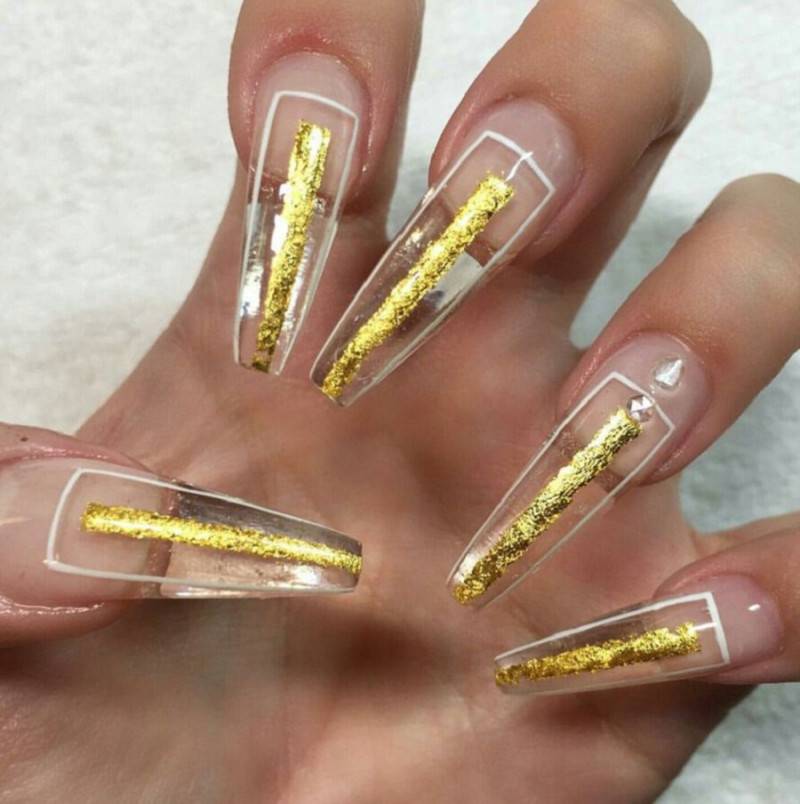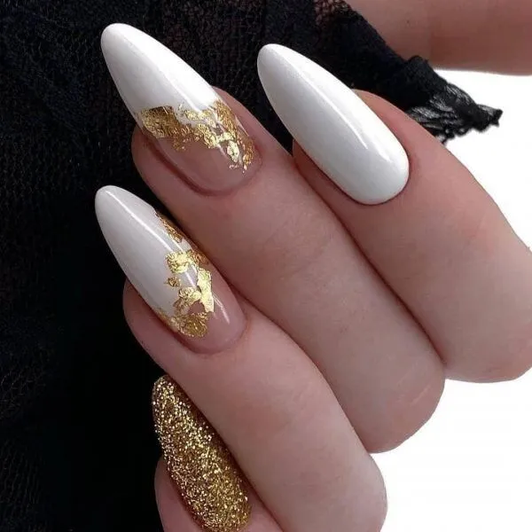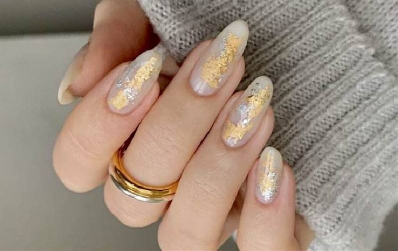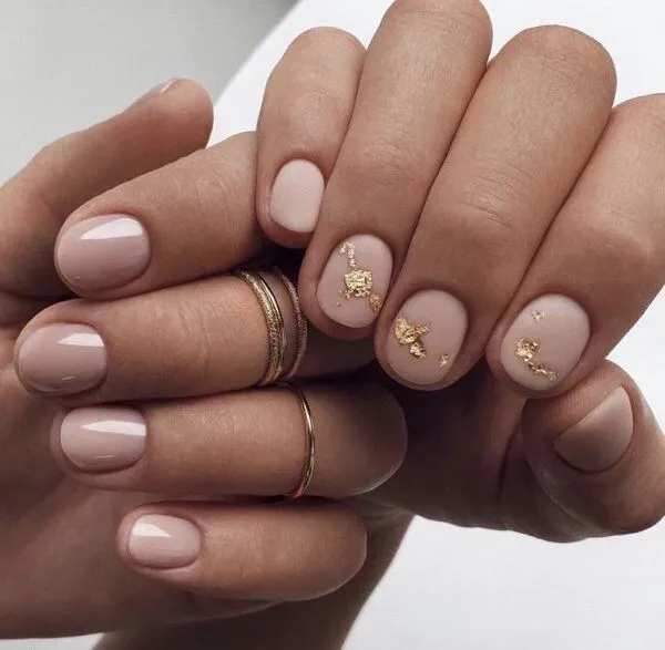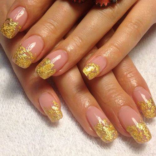 Маникюр, который сделает женские ручки опрятными, аккуратными и ухоженными должен выглядеть следующим образом: прозрачный или молочный топ + поталь золотого цвета. данный дизайн можно выполнять в разном стиле, например, располагая поталь аккуратно в определенном месте или же располагая ее хаотично по всей поверхности ногтевой пластины. В данном процессе включайте свою фантазию и творите, главное соблюдайте правильную последовательность действий. Глянцевый финиш раскрывает сияние и блеск потали, а матовый добавляет сдержанности и утонченности маникюру.