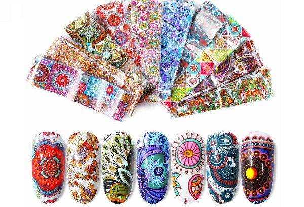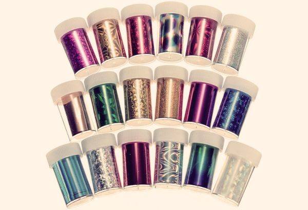 Для новичков этот вариант наиболее оптимален, так как выбор узоров огромен, а цена минимальна. Переводная фольга выпускается в рулонах, упакованных в миниатюрный флакон из пластика. Наносить её можно как на гель, так и на обычный лак.