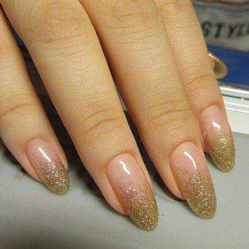 Основные оттенки просушиваются поочередно, после этого можно приступать к дизайну. Если золото присутствует в виде блесток отдельно, их нужно аккуратно извлечь из баночки кистью, которую стряхивают на ногти. Последний слой основы должен оставаться липким. Нельзя забывать запечатывать созданную композицию финишным покрытием. Золотой шеллак на фото ниже сделан с добавлением микроблесток отдельно.
