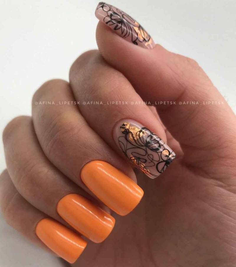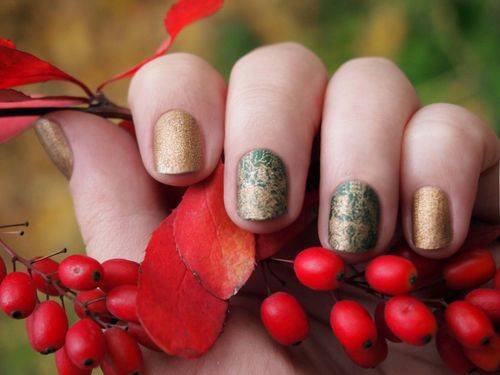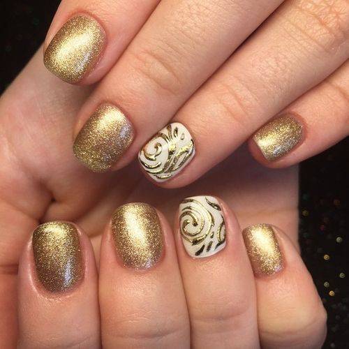 И первым рисунком мы будем делать свои ногтики золотыми, а безымянный пальчик украсим интересной художественной росписью. По-моему сочетание цветов идеальное, но можете поэкспериментировать.