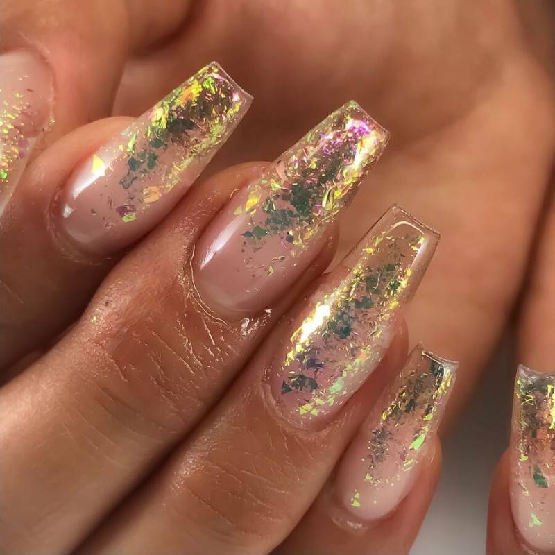Самый простой и эффективный способ создать трендовый дизайн маникюра предполагает под собой использование базы с поталью разных цветов. Обязательное условие — это липкий слой у базы, иначе поталь не сможет приклеиться к ногтевой пластине.
