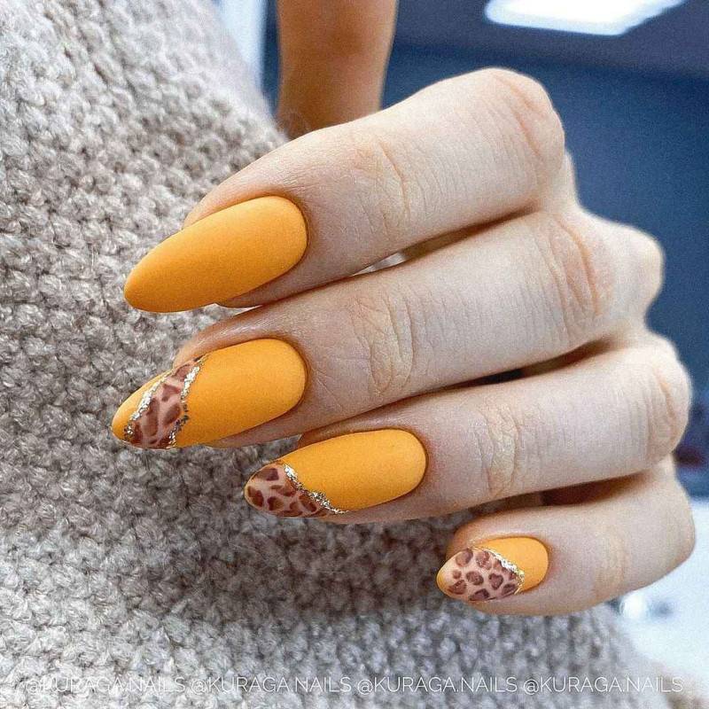 С помощью потали также можно создать красивый френч и необязательно классический. На пике популярности в 2021 году асимметричный, круговой, квадратный, треугольный, геометричесий. Эти варианты дизайна станут достойным украшением образа современной модницы. Кроме того, поталь можно использовать и в паре с принтами, например, леопардовым, змеиным, коровьим, тигровым и так далее.