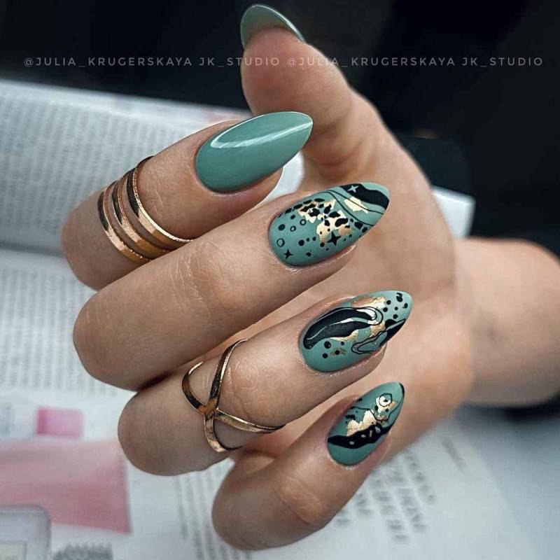- Нанесите на подготовленный ноготь стемпинг или же нарисуйте собственноручно произвольный рисунок, в тренде абстрактные изображения.