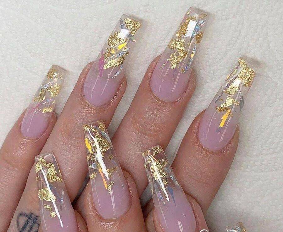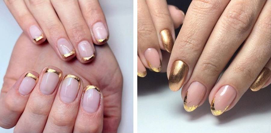 Маникюр, который сделает женские ручки опрятными, аккуратными и ухоженными должен выглядеть следующим образом: прозрачный или молочный топ + поталь золотого цвета. данный дизайн можно выполнять в разном стиле, например, располагая поталь аккуратно в определенном месте или же располагая ее хаотично по всей поверхности ногтевой пластины. В данном процессе включайте свою фантазию и творите, главное соблюдайте правильную последовательность действий. Глянцевый финиш раскрывает сияние и блеск потали, а матовый добавляет сдержанности и утонченности маникюру.