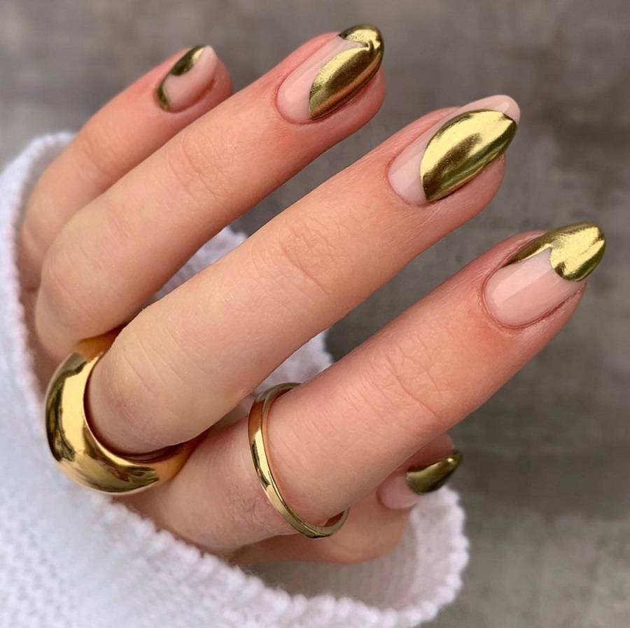 Литье может стать частью дизайна френч и его модифицированных версий – лунного, стилизованного, цветного французского маникюра. Если цвет свободного края ногтя может быть любым, почему бы ему не быть металлическим?