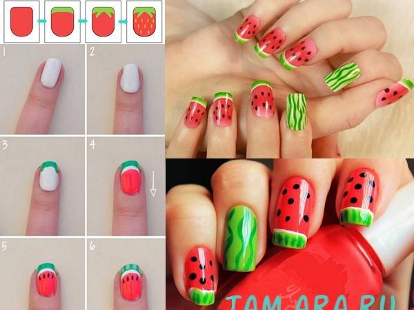 Фруктовый маникюр никогда не выйдет из моды. Особенно актуален он будет летом. Дизайн ногтей с фруктами можно сделать с помощью наклеек, фимо, или же нарисовать разноцветными лаками. Как выполнить различные фруктовые рисунки показано на пошаговых фото. Очень простые варианты киви и арбуза: