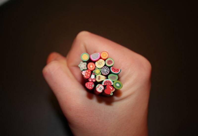 Фимо украшения – это готовые вырезанные детали. Исходным материалом для заготовки служит трубочка, длина которой достигает 5 см и диаметром 5 мм. Изготавливаются они из полимерной глины и окрашены различными оттенками. Изначально объемный дизайн использовался только для наращенных ногтей, но сейчас можно украсить различными фруктами и зверюшками натуральные пластины.