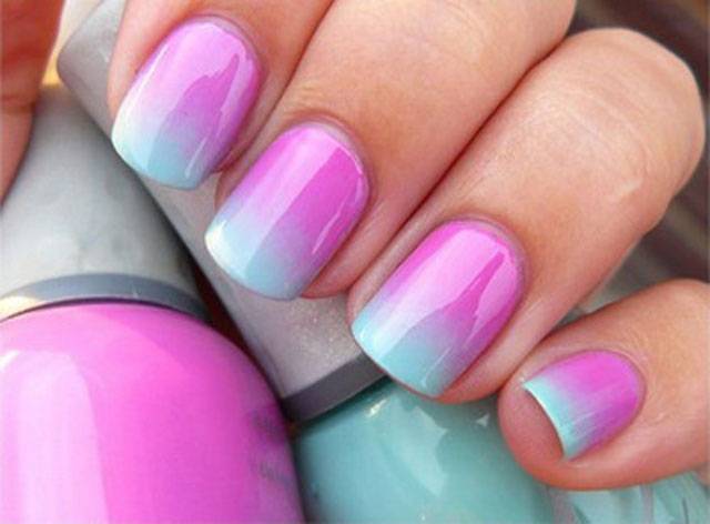 Особо популярный сейчас вариант маникюра – градиент. Он отличается от обычного маникюра тем, что границы между цветами не чёткие, а как будто размытые, с плавными переходами.