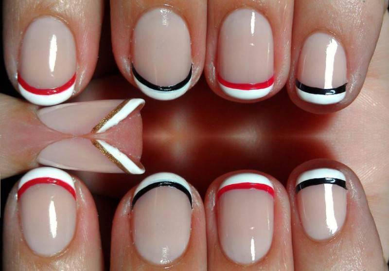 - Нанесение по краю ногтевой пластины красного, черного и золотого лака. Делать это лучше при помощи тонкой кисти, но, если получится, можно обойтись и обычной.