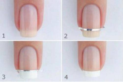 На фото: полоски для французского маникюра и алгоритм их использования в четырех шагах.