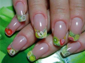 Этот материал используют для креативного френча. Представляет собой такой декор разнообразные элементы, нарезанные тонким слоем из продолговатых палочек. Это разнообразные звездочки, фрукты, ягоды, которые попросту клеят в зоне отросших ногтевых пластин. Декор объемен, а потому назвать такой маникюр удобным в быту нельзя. Однако фимо можно использовать в аквадизайне, запечатав сверху несколькими слоями моделирующего средства.