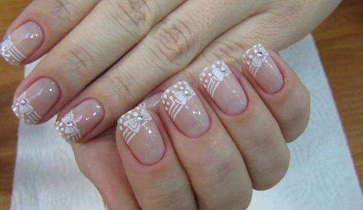| свадебный френч | Дизайн украшается различными элементами: кружево, вензеля, лепка, стразы, жемчужины, маникюрные ленты и многое другое. |