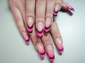 6. Фан-френч. Его делают на нарощенных ногтях. Из всех видов, это наиболее оригинальный и красивый маникюр. Свободный край ногтя украшают стразами, бусинками, фольгой, акрилом, перышками, кружевом . Линию улыбки не обязательно делают классической формы. Она может идти по диагонали, уголком, быть зигзагообразной.