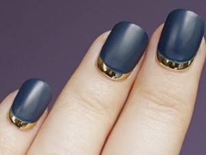 5. Лунный френч. Иногда еще его называют – «френч наоборот». Белым, золотистым или другим контрастным цветом покрывают край ногтя находящийся у основания. Лак наносят в виде тонкой линией полумесяцем. Модницы оценили удобство этого дизайна – по мере отрастания ногтевого корня, его подкрашивают, увеличивая в ширине полоску.