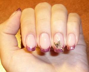3. Френч-миллениум. На отросшую часть ногтя, вместо колера, накладывают микропудру, блестящие лаки, блестки, и прочие мелкие предметы, которые блестят. Они должны наноситься плотным слоем, чтобы ноготь не просвечивал.