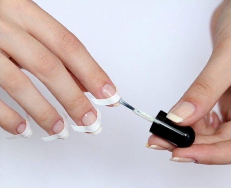 Пожалуй, самым простым вариантом являются полоски. Они приклеиваются на ногтевое ложе, покрытое бежевым лаком, зона для прорисовки (кончик) остается свободной. После этого кончик окрашивается белым или любым другим цветом. На первый взгляд, все предельно просто, но у этого способа есть один недостаток – легко испортить основное покрытие в виде телесного лака.
